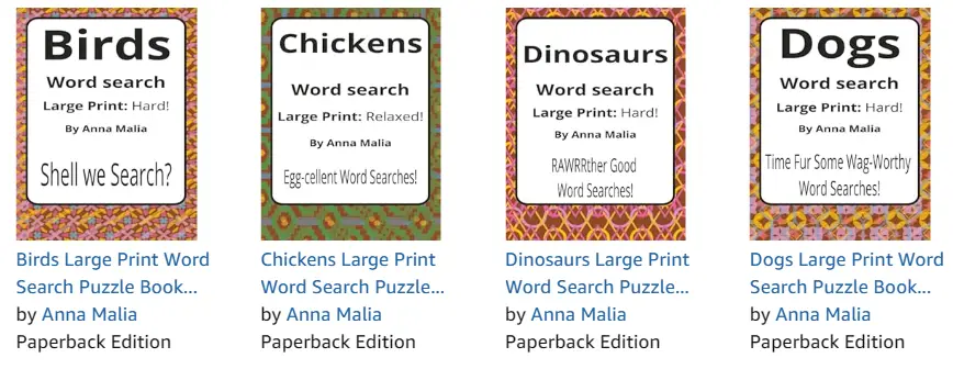 - Animal-themed word searches featuring dogs, birds, horses, chickens, dinosaurs, and more.